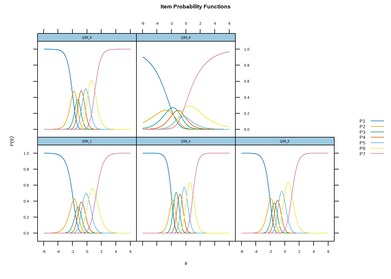Попробуйте оценить gpcm для оставшихся пяти вопросов в выборке \(\{2,3,7,8,10\}\). Поиграйте, попробуйте выбрать другую модель из списка, \(?mirt\), сравните оцениваемые параметры и прогнозы, которые дают разные модели.